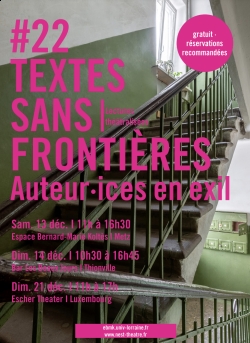 Cette année, le festival propose un focus sur les artistes en exil. Comment, pour qui écrit-on lorsqu'on a dû fuir son pays pour éviter la prison, la torture, la censure ou la mort ? Quatre textes ont été sélectionnés par le comité de lecture du festival :
